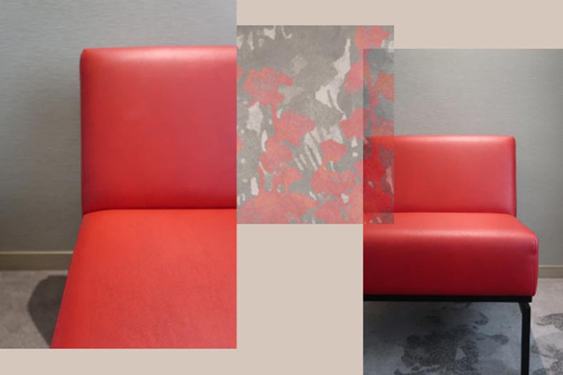 - contrasting the pop of rouge in the sofa upholstery and carpet