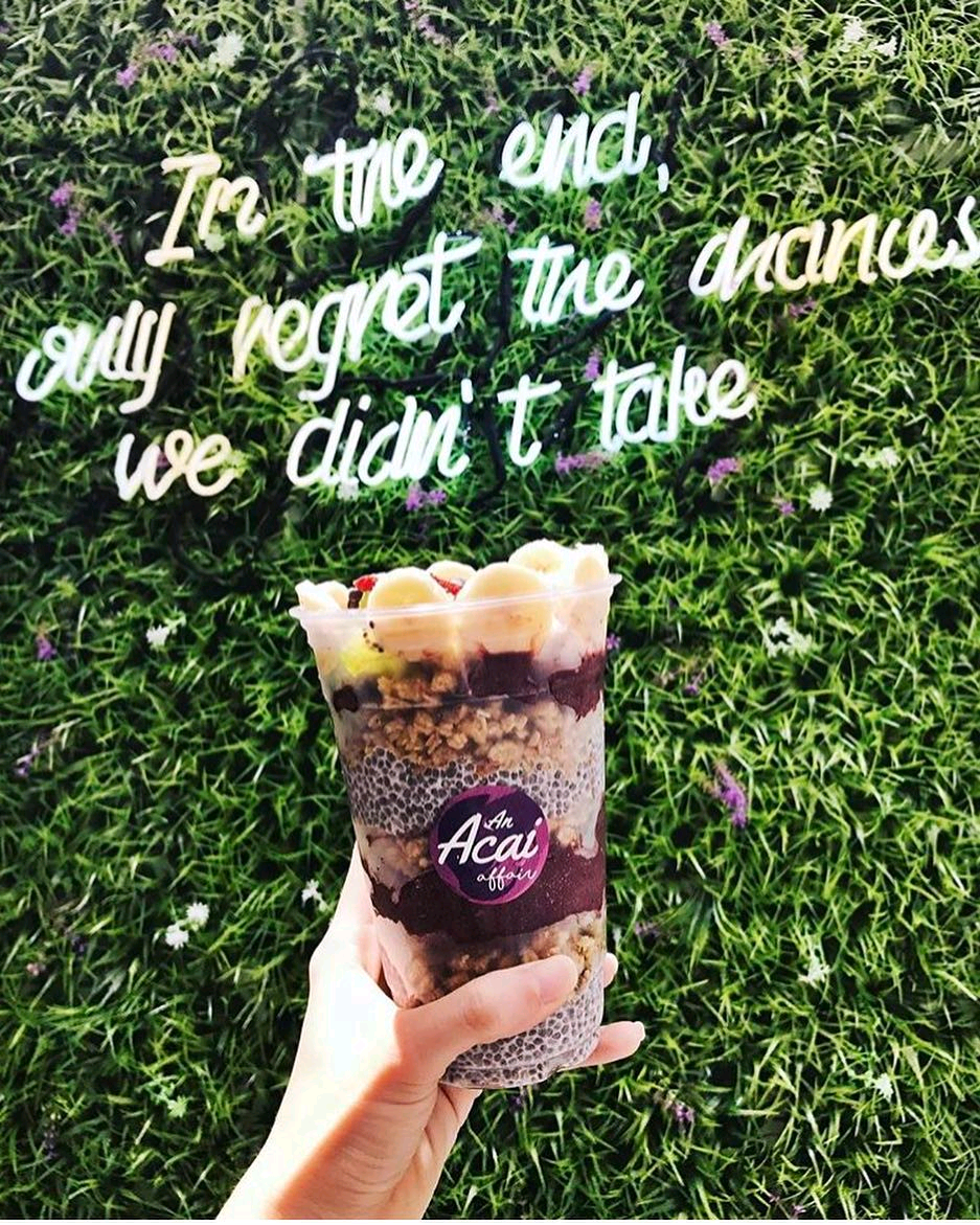 Sure acai bowls already look fancy schmancy with slices of banana and coconut flakes atop, but if you wanna give your ‘gram of the dessert an extra oomph, take a picture of it against the grass wall and neon light quote at An Acai Affair!