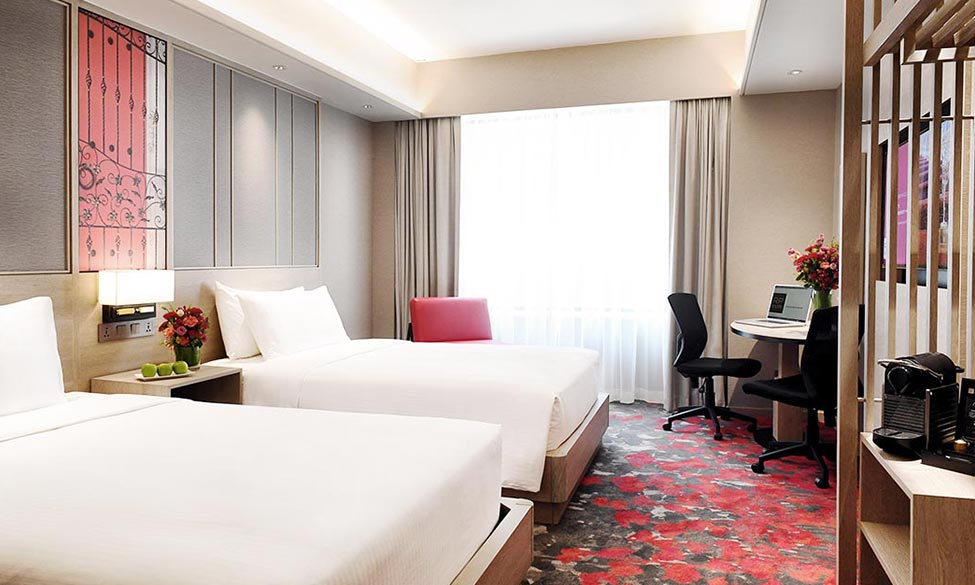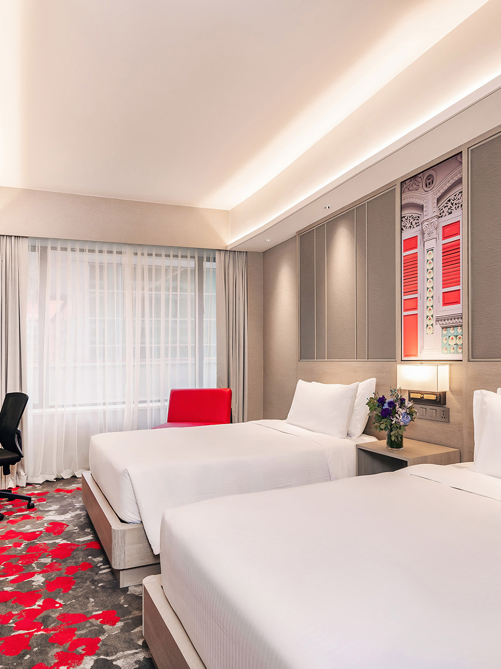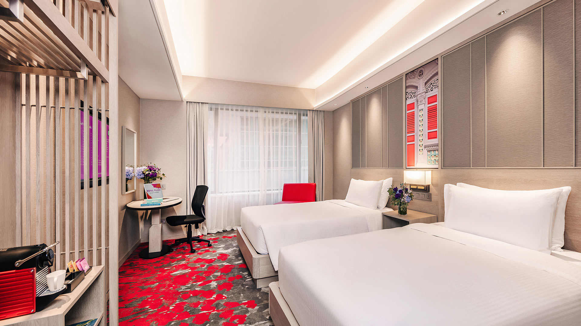 配备2张席梦思睡床,宾客可以在充满艺术风格的房内各自享受舒适的时光。